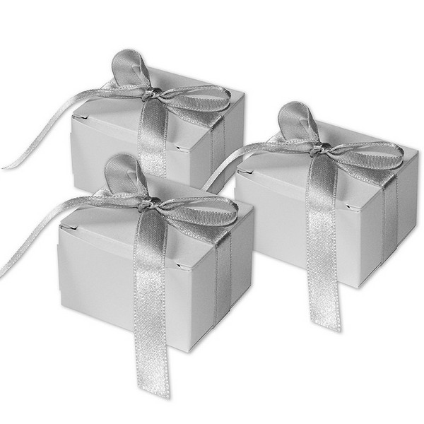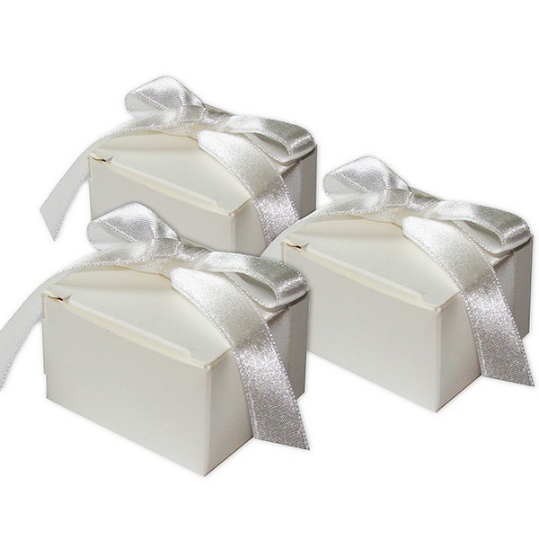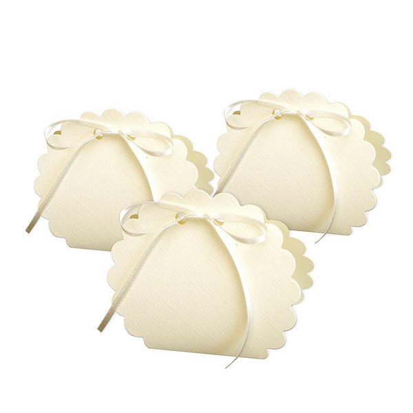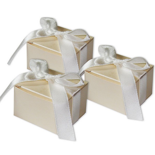 Pudełko na drobny prezent (migdały, cukierki). Wykonane ze sztywnego ozdobnego papieru w kolorze ecru, przewiązane satynową wstążką. Ozdobne wycięcia wykonane metodą cięcia laserowego. Pudełka do samodzielnego złożenia.